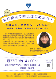 【日 程】2026 年1月23日(金) 【時 間】午後2時〜3時30分 【対 象】どなたでも 【講 師】金香百合(堺市立男女共同参画センター館長) 【会 場】大阪YWCAシャロン千里2階ホール 【参加費】800円 【申込方法】電話・FAX・Email等 【主 催】大阪YWCA千里委員会 【後 援】吹田市教育委員会